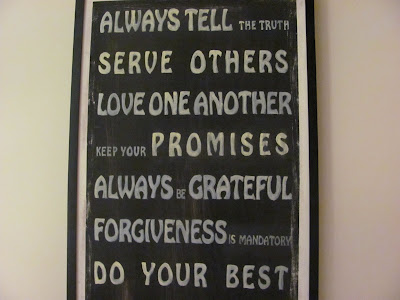 Here's a way to use up a bunch of those smaller and odd sized frames. I collected a bunch, painted them all black and then played with the arrangement on the floor first. You can even lay out some large sheets of paper and trace where each item goes, tape it to the wall and nail each in place. When all hung, just rip down the paper. HINT: when hanging groupings, especially in high-traffic areas, I like to use a 3M adheshive square at the bottom of each item to keep them from going crooked on me. It'll save you OCD people like me from going nuts!
