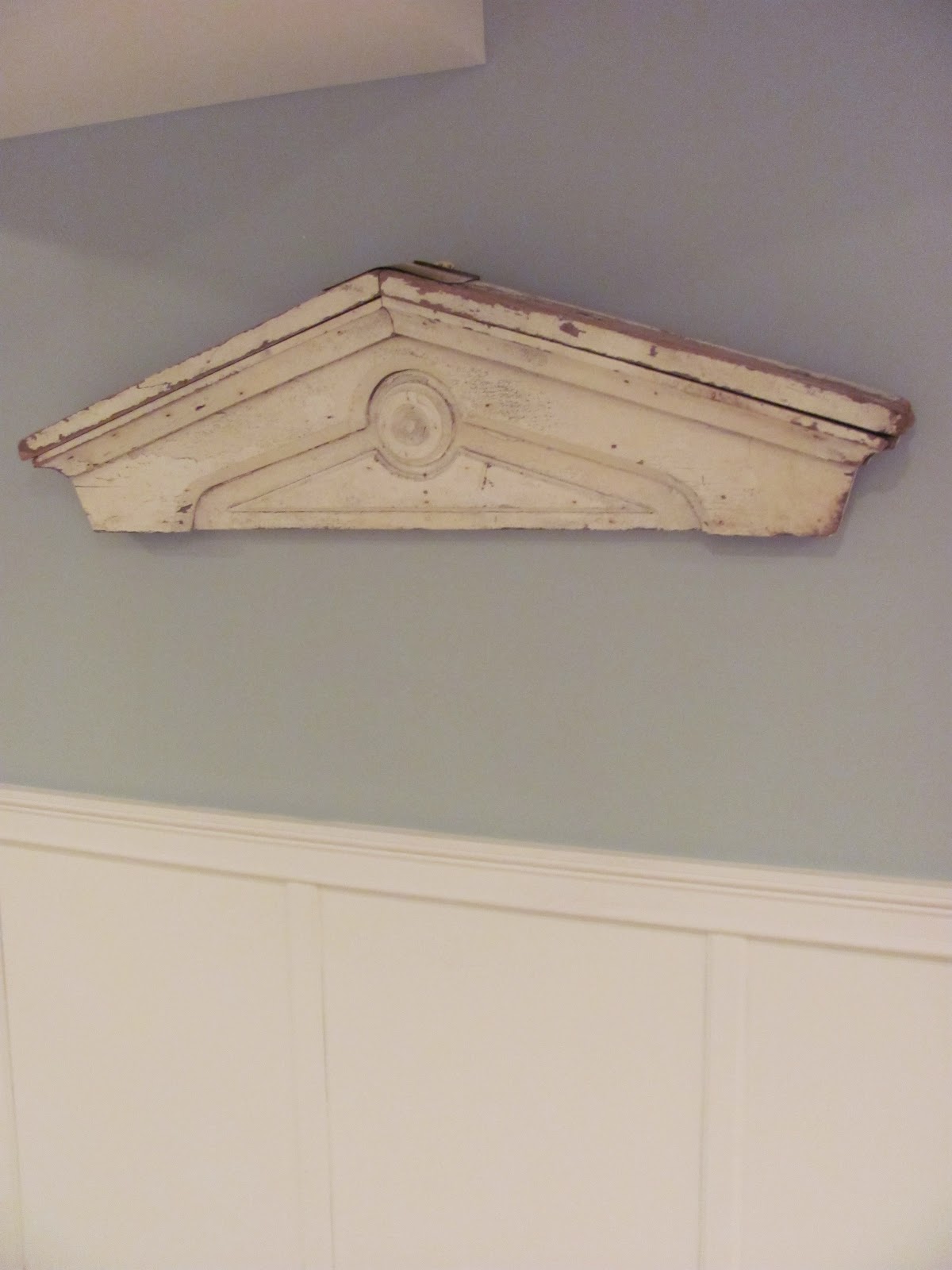 I found this huge clock for a measley $5 at a garage sale and the old door pediment was also in someone's trash (yup, no self-respect!)