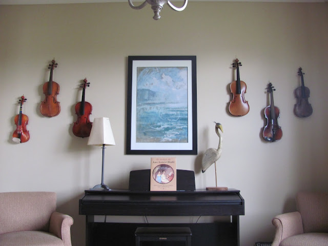 Here's the other side of the room where the couch used to be. I got rid of the plum wall and painted it to match the rest of the room. I kept the antique violins we've collected from our travels (my husband and two daughters also play violins-so they're meaningful decorations for our family.) I changed out the artwork to something with more blue in it to tie in the fabrics. I actually just got the print from Costco's online photo lab. They have tons of art there for free that you can have enlarged to any size for unbelievable prices. I think this huge print was only $12.99! I love the colors and texture in it! I pulled in these accent chairs from another room and plan on either dye-ing them or recovering them if that doesn't work out.